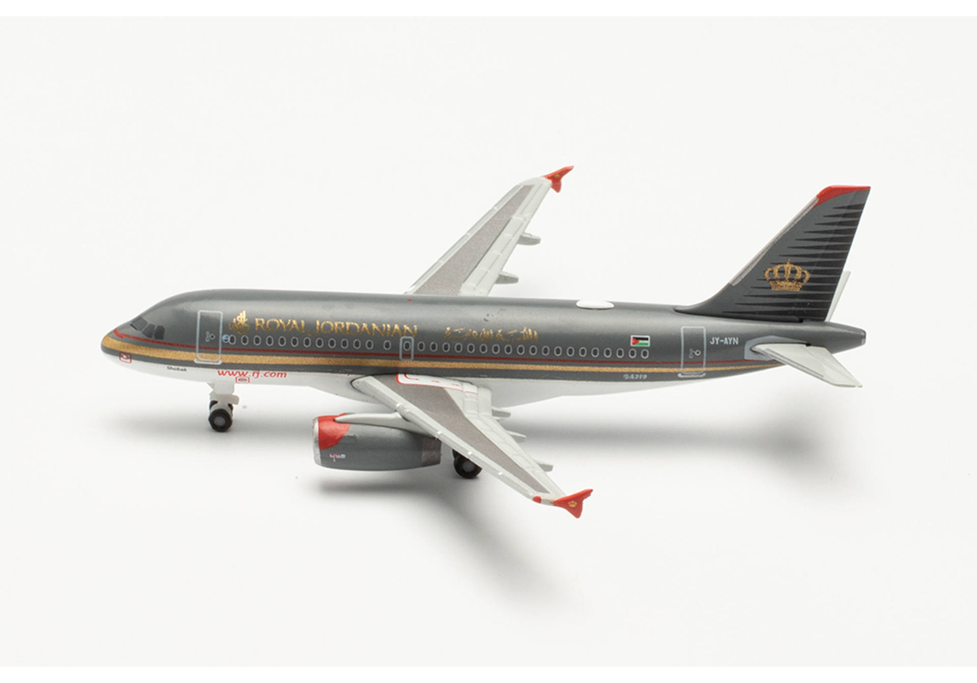 SOLD OUT: only customers who reserved this item in time will be able to buy it from us. If this item is in your reservation list WITHOUT the message 'not available anymore', you reserved it in time. A total of five A319s are operated by the national carrier of the Kingdom of Jordan. YA-AYN was the first of these five and is named after Shobak Castle, a fortress original built by crusaders in the year 1115.