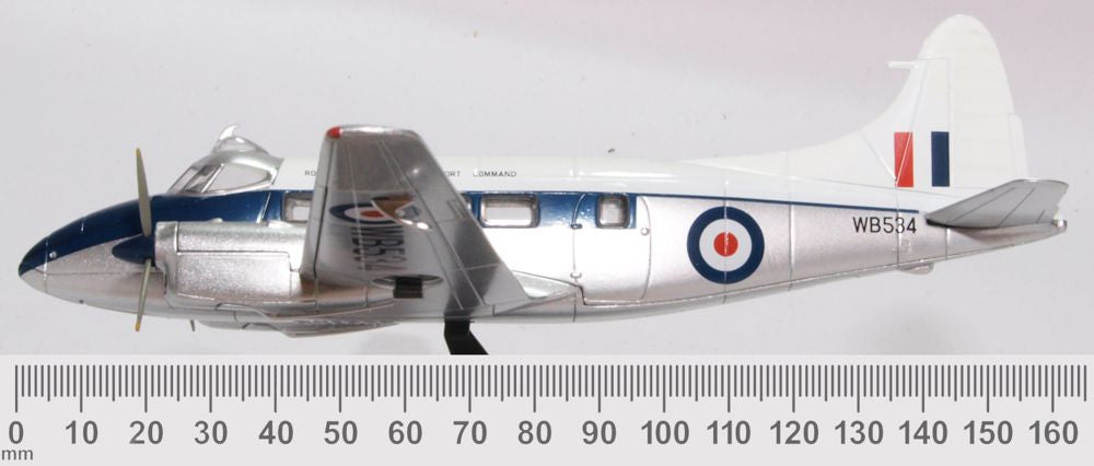 Decorated in an attractive white, silver and royal blue colour scheme to the upper wings and fuselage, the underside is painted silver. The clear canopy reveals the cockpit and instrument panel detail in grey and the passenger area in light tan. Even the propeller spinners are given a royal blue finish. The RAF markings and WB 534 identity round off a very attractive example of this sleek aircraft.