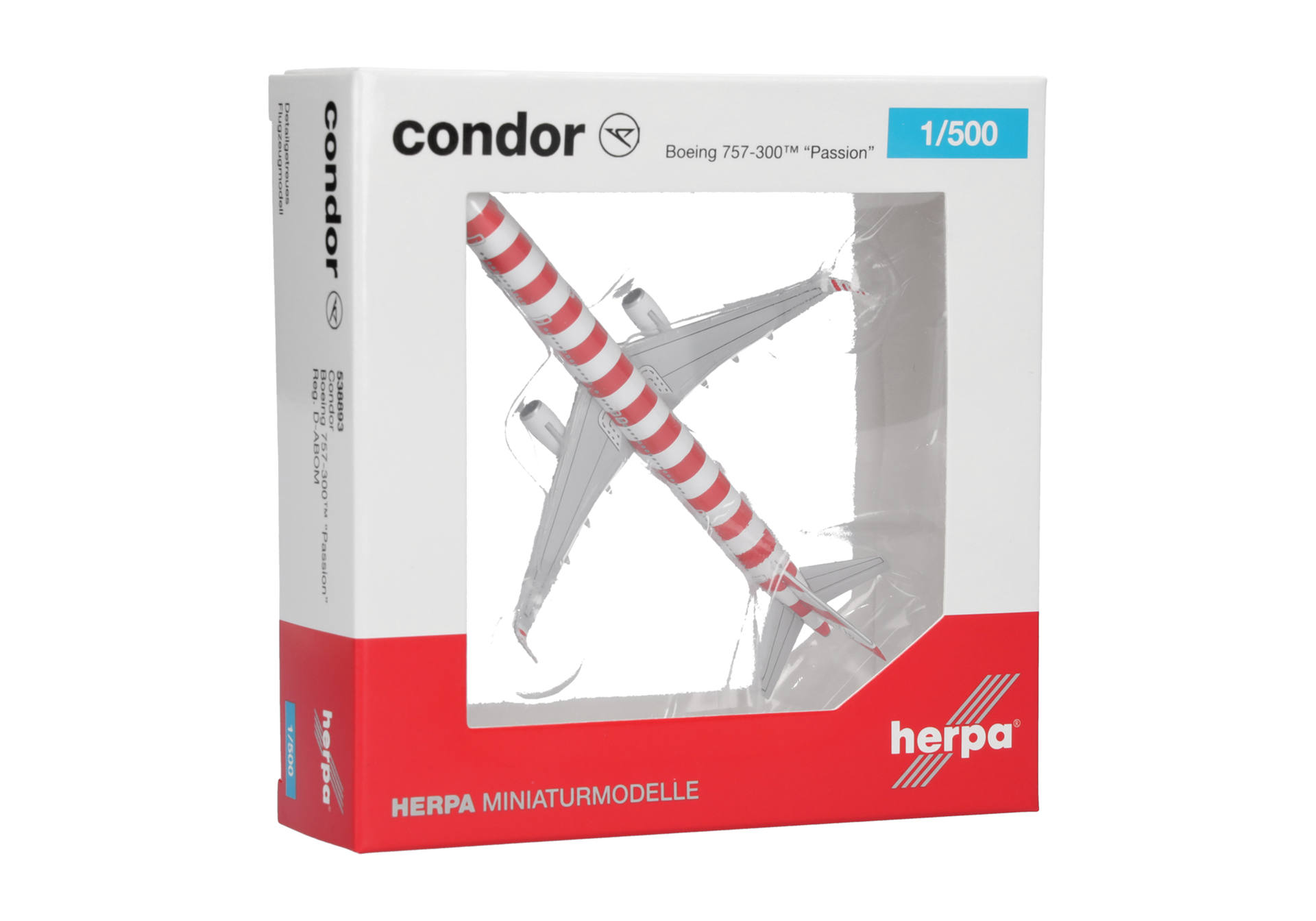 A 35-year chapter has come to an end: with a special flight from Frankfurt to Vienna on November 5, 2025, the era of Boeing’s 757 which began back in the year 1990 with the delivery of the first 757-200s came to a close at the German leisure airline. By the end of October, six stretched-fuselage 757-300s were still in service. Among them D-ABOM, which had been given the current livery in January 2023, in this case with the eye-catching stripes in "Passion Red". The 757-300 has already been released in the 1/500 scale in "Island Green", "Sunshine Yellow", and "Sea Blue". This new addition now completes the small series.